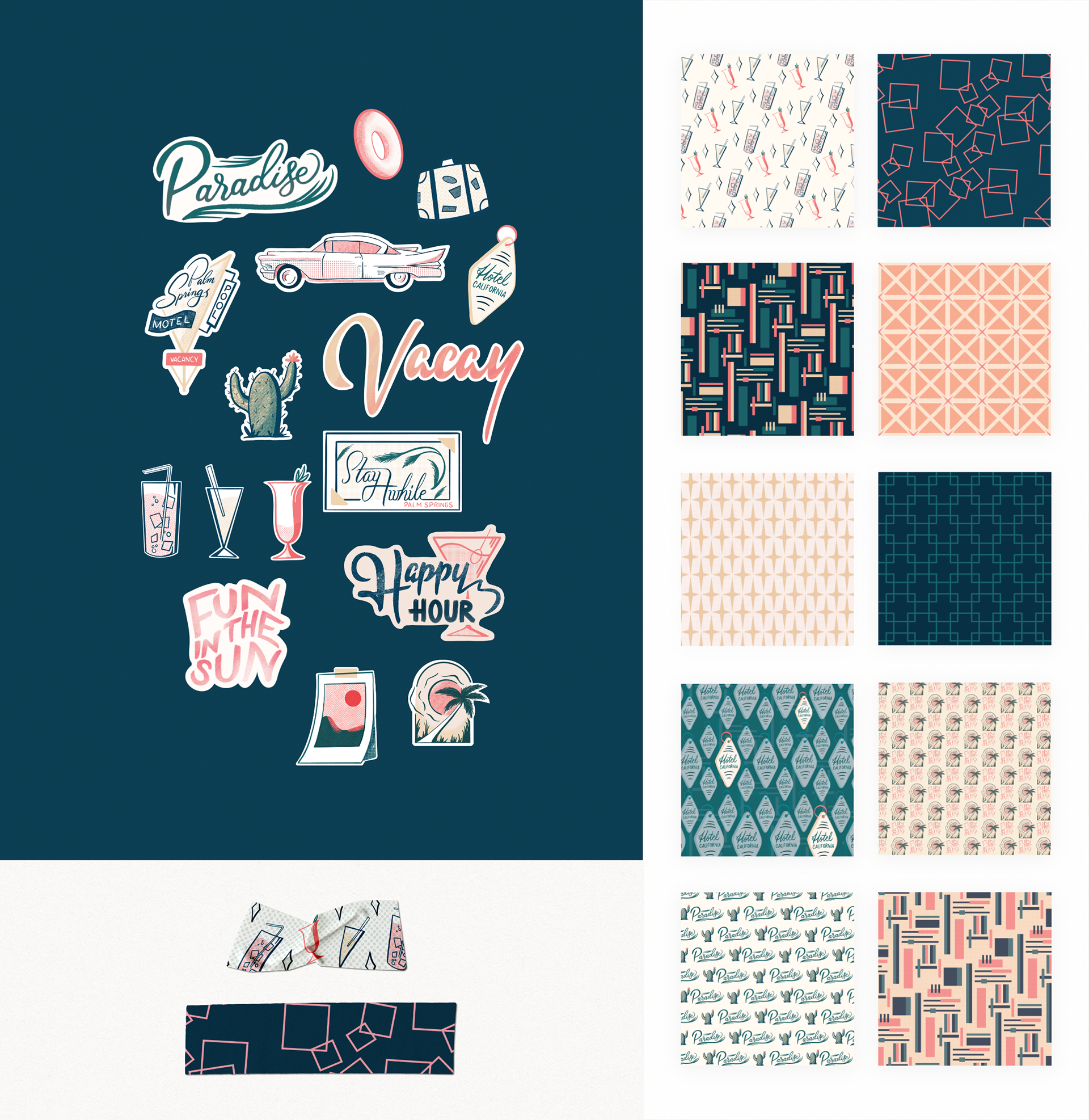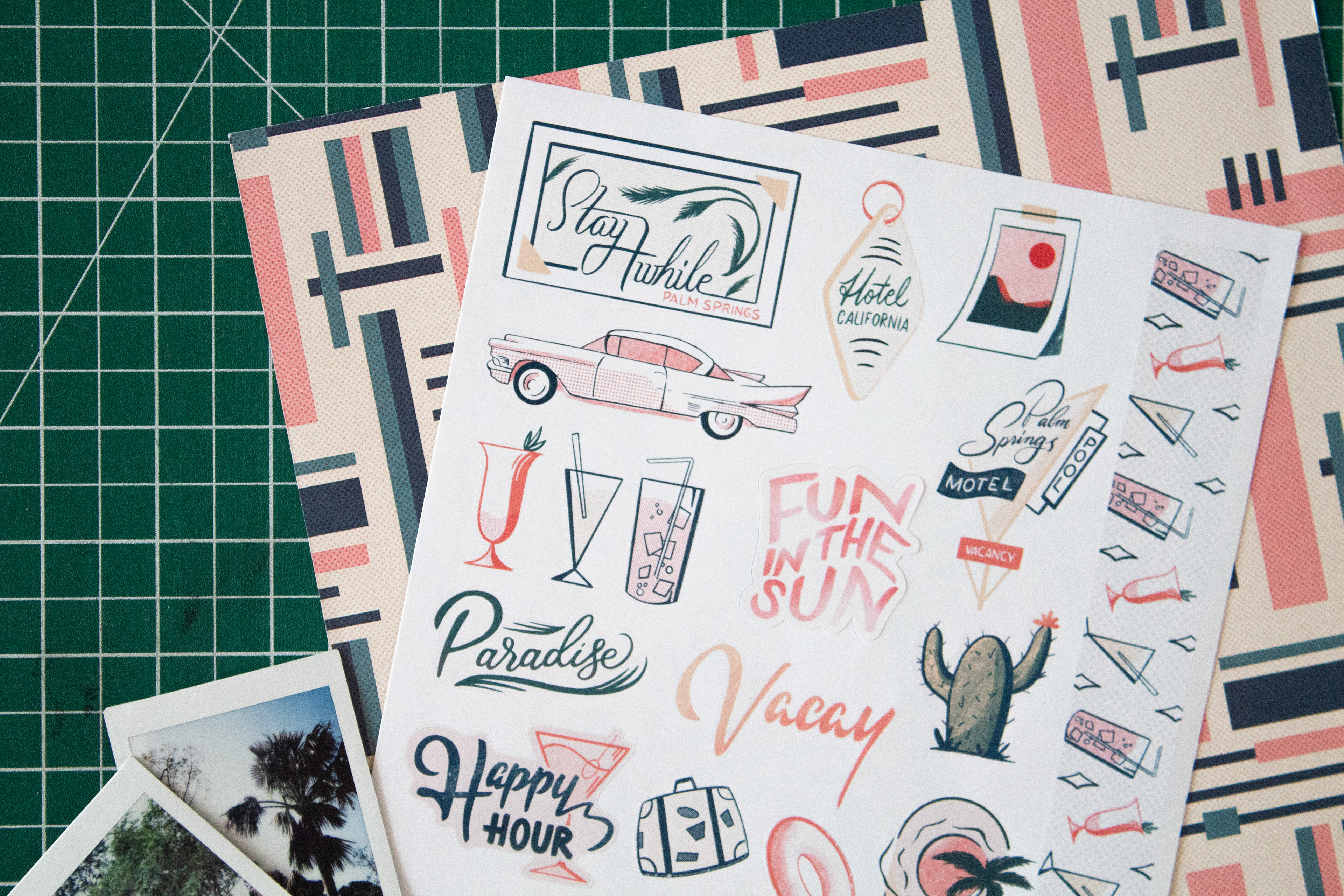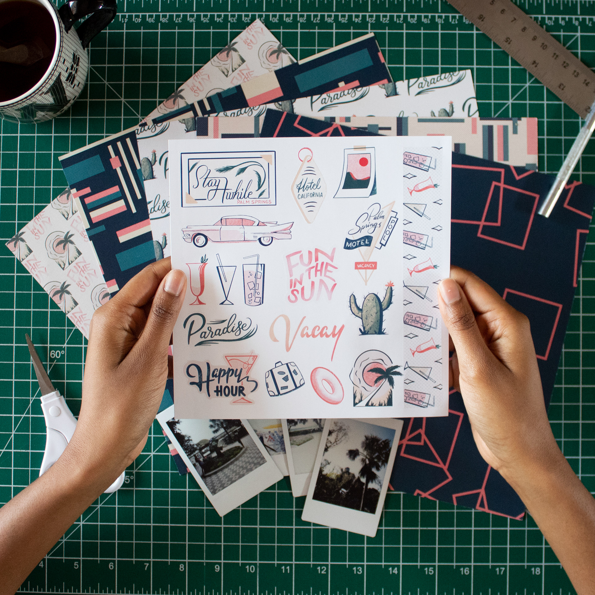 This Retro Palm Springs Scrapbooking Pack consists of sixteen stickers, ten patterns and two washi tapes. Perfect for any stationery needs.